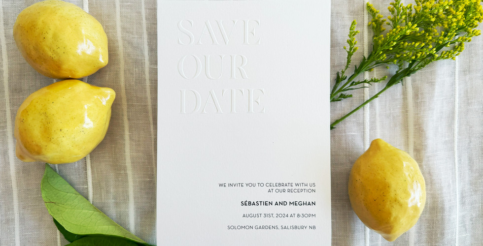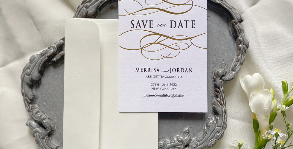 We offer pre-designed Save the Dates with specialty finishes like foil, blind-press, or embossing already included, so you get a luxe look without a custom design fee.
